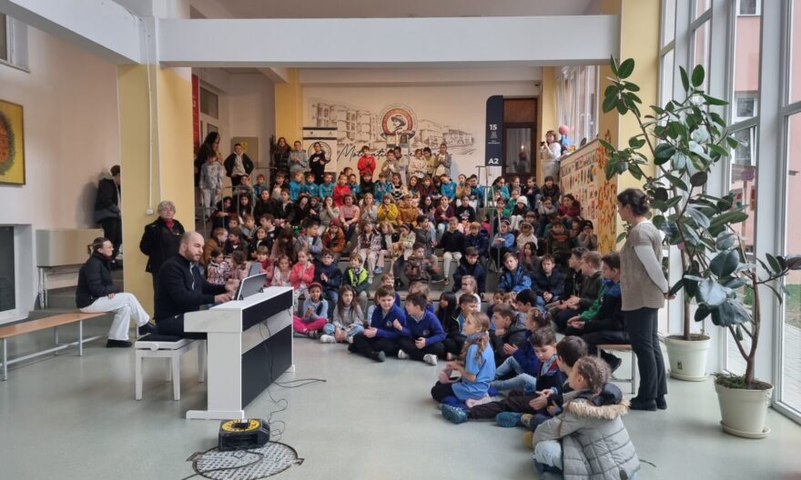 Pianistul Ioan Dragoș Dimitriu a declarat pentru „Făclia” că evenimentul desfășurat la Colegiul Național „George Coșbuc” face parte din proiectul SoNoRo Kids: „Am venit cu festivalul SoNoRo la Cluj-Napoca. Avem o săptămână de concerte din 11 noiembrie până în 16 noiembrie. Pe lângă concertele pe care le susținem în sălile consacrate de concerte, avem și acest proiect SoNoRo Kids. Mergem în școli și le cântăm copiilor, cu un program interactiv. Le vorbim despre muzică, elemente din viața noastră de zi cu zi, cum ar fi: micul dejun, anotimpurile, ce facem cu plăcere în timpul liber, dar conectate la muzică. Ideea este să aducem muzica clasică, jazz sau pop mai aproape de copii ca să înțeleagă că muzica live este interesantă și merită să fie ascultată”. Cunoscutul pianist a spus că scopul activității muzicale este de a-i apropia pe copii de muzica live: „Să vadă că artiștii nu sunt pe un piedestal, ca niște icoane la care ne închinăm, ci sunt aproape de ei. Pentru mine este cel mai important punct, să înțeleagă că ei pot să intre în legătură cu artiștii, că pot să vorbească cu ei și să le pună întrebări. Este chiar indicat să facă acest lucru ca să învețe mai mult despre muzică”. Talentatul artist a cântat la pian pasaje muzicale din îndrăgitele desene animate „Tom și Gerry, dar și din „Eine Kleine Nachtmusik” de W.A. Mozart sau „Anotimpurile” de Antonio Vivaldi, secvențe pe care „copiii le recunosc ușor și se pot conecta imediat”. Apoi, un alt câștig pentru copiii, în opinia muzicianului, este acela că „învață despre istoria muzicii, despre cultură, despre lucruri care există de sute de ani și care stau la baza a ceea ce noi numim noi pop culture”. Despre interacțiunea micilor spectatori cu muzica, pianistul Ioan Dragoș Dimitriu a afirmat că „la copii găsești mult mai multă deschidere decât găsești la adulți”. „Cumva imediat înțeleg ritmul, tonalitățile, despre ce este vorba în muzică și imediat se prind dacă nu ai energia necesară, dacă ești mai trist. Sunt cel mai bun critic. Când ajungi la o clasă de copii, trebuie să-i ții de fiecare dată în priză și trebuie să știi cum să te reconectezi cu ei”. La rândul său, directorul adjunct al Colegiului Național „George Coșbuc ”, Alexandra Mihălțan, a declarat că artiștii de la SoNoRo au cântat și anul trecut pentru elevii din ciclu primar, de la secția germană: „Musafirii fac parte din Grupul SoNoRo. Vin din Brașov, de la o școală cu predare în limba germană cu tradiție. Ne-au vizitat și anul trecut. Fac activități muzicale, foarte impresionante pentru copii pentru a-i educa să fie atrași, să le placă muzica clasică. A fost un proiect susținut de domnul Thomas Șindrilaru, subsecretar de stat în Departamentul pentru relații interetnice din cadrul Secretariatului General al Guvernului României, care se ocupă de partea minorității germane, un proiect pe care noi îl apreciem mult. Ne dorim foarte mult să implicăm elevii și școala în activități alături de comunitatea germană. Anul trecut, la acest eveniment au participat copiii de ciclu primar, de la secția germană, iar anul acesta le-am oferit șansa și elevilor de la secția română să se bucure de acest proiect.” Directoarea adjunctă a amintit faptul că evenimentul se derulează în cadrul activităților tematice care-l sărbătoresc pe Sfântul Martin: „Ducem tradiția germană mai departe. Luni, 10 noiembrie 2025, am oferit limonadă tuturor elevilor școlii, iar elevii din ciclul primar, de la secția germană, au participat la Sărbătoarea lampioanelor în amintirea lui Martin, soldatul roman, care și-a împărțit, într-o zi de iarnă, mantia cu un om sărac, înfrigurat. Copiii au purtat lampioane colorate și au cântat cântece vesele. Astăzi și elevilor de la secția română le oferim în dar acest miniconcert”. Articol de Tia Sirca